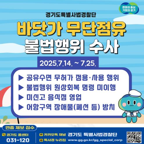 ▲ 경기도 특사경, 휴가철 맞아 바닷가 무단점유 불법행위 집중수사 |