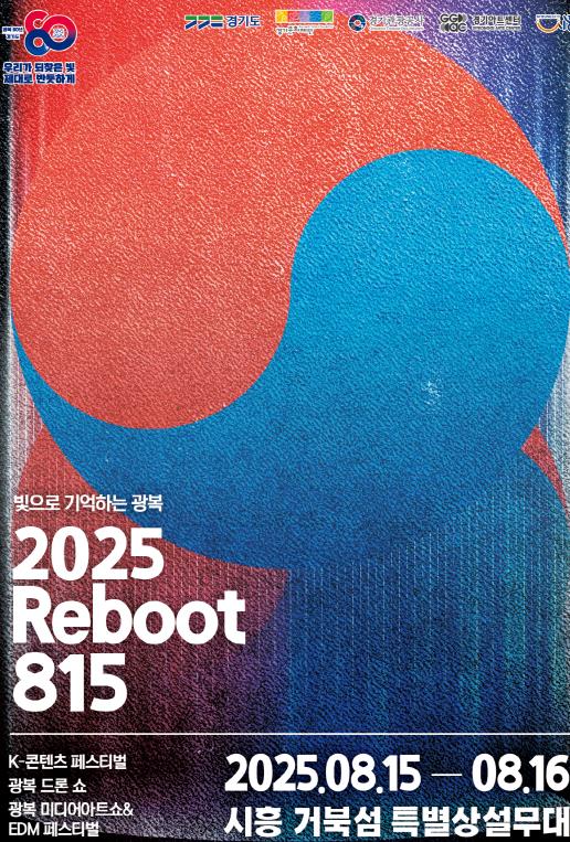 8월 15일과 16일까지 이틀간 시흥 거북섬에서는 ‘빛으로 기억하는 광복’이라는 부제로 ‘2025 리부트(Reboot) 815’ 행사가 개최된다. K-콘텐츠 페스티벌, 드론쇼, 미디어아트 쇼, 일렉트로닉 댄스 뮤직(EDM) 공연, 체험 전시 등으로 구성된 경기도 주최의 문화예술 종합 축제다.