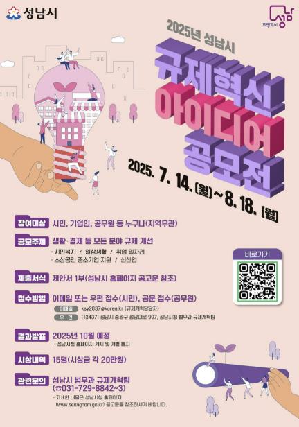 [뉴스노크=김인호 기자] 성남시는 오는 7월 14일부터 8월 18일까지 ‘규제혁신 아이디어’를 공모한다.