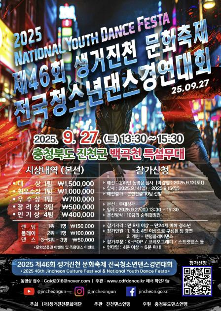 [뉴스노크=김인호 기자] 충북 진천군 (재)생거진천문화재단은 오는 9월 27일 제46회 생거진천 문화축제를 맞아‘전국 청소년 댄스 경연대회’를 백곡천 메인 무대에서 개최한다고 27일 밝혔다.