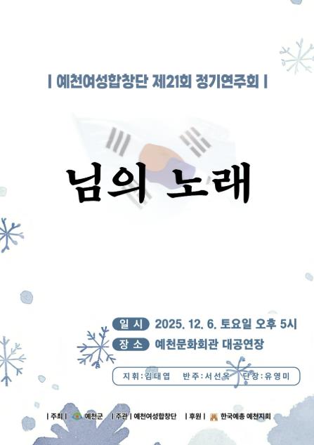 김학동 예천군수는 “올해로 21번째 정기연주회를 맞이하는 예천여성합창단이 지나온 시간을 발판 삼아 앞으로도 지역 문화 예술 발전에 앞장서며 예천의 아름다운 소리를 더욱 널리 알리고 지역사회와 함께 성장하는 예술단체로 거듭나기를 바란다”고 전했다.
