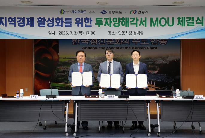 [뉴스노크=김인호 기자] 경상북도와 안동시는 7월 3일, 안동시청 청백실에서 ㈜제이오푸드와 87억 원 규모의 식육․식품 제조공장 신설에 대한 투자 양해각서를 체결했다.