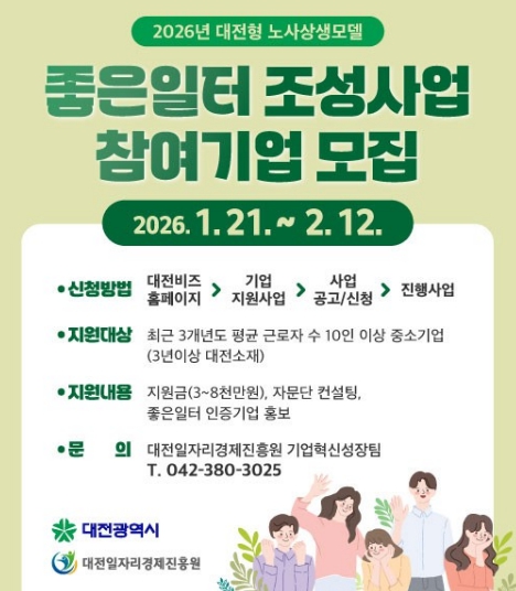 [뉴스노크=김인호 기자] 대전시는 1월 21일부터 2월 12일까지 대전형 노사상생 모델‘2026년 좋은 일터 조성사업’에 참여할 12개 기업을 공개 모집한다.