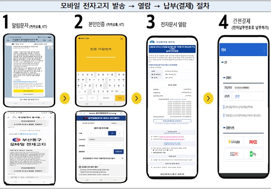 [뉴스노크=김인호 기자] 부산시는 기존 우편(종이) 송달하고 있는 지방세 관련 각종 고지·안내문을 전자문서 형태로 공인전자문서중계자(카카오, KT, SKT, LGU+) 문자 메시지로 전송하는 '모바일 전자고지 서비스'를 2월부터 본격 시행한다고 밝혔다.