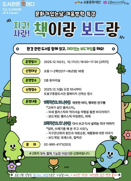 [뉴스노크=김인호 기자] 서울 도봉구 도봉아이나라도서관이 겨울방학 특별 프로그램으로 ‘책이랑 보드랑’을 운영한다.