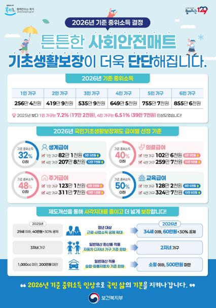 2026년도 기준 중위소득은 1인 가구 기준 256만 4천 원으로, 지난해 239만 2천 원 대비 7.2% 인상된다. 이에 따라 1인 가구의 기초생계급여 지원액도 기존 76만 5천 원에서 82만 원으로 상향 조정된다.