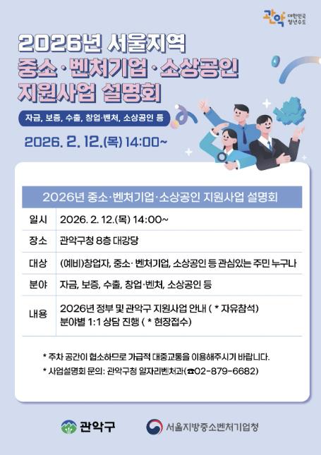 [뉴스노크=김인호 기자] 관악구가 지역 경제의 주축인 중소·벤처기업과 소상공인의 경영 안정을 돕고, 혁신 성장의 발판을 마련하기 위한 대규모 정책 소통의 장인 오는 12일(목) 14시 관악구청 8층 대강당에서 ‘2026년 중소벤처기업·소상공인 지원사업 설명회’를 개최한다.
