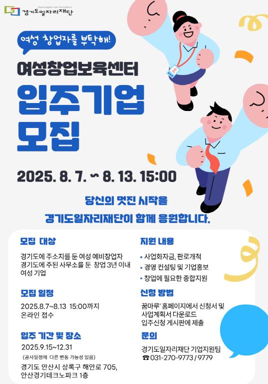 [뉴스노크=김인호 기자] 경기도일자리재단이 여성 창업 생태계 활성화와 유망 여성 창업기업의 성장을 지원하기 위해 오는 8월 7일부터 13일 오후 3시까지 ‘2025년 경기도여성창업보육센터’ 신규 입주기업을 모집한다.