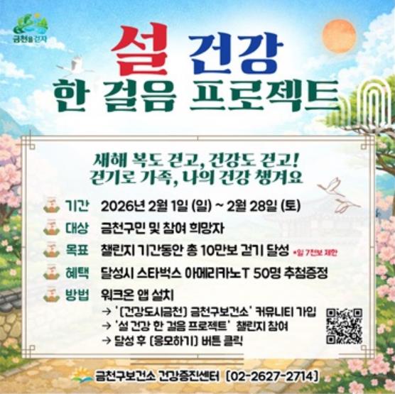 유성훈 금천구청장은 “걷기를 통해 생활 리듬을 회복하고, 일상 속 건강관리의 중요성을 체감하는 계기가 되길 바란다”라며 “앞으로도 지역주민들이 부담 없이 참여할 수 있는 생활밀착형 건강사업을 통해 건강도시 금천을 지속적으로 만들어 나가겠다”라고 말했다.