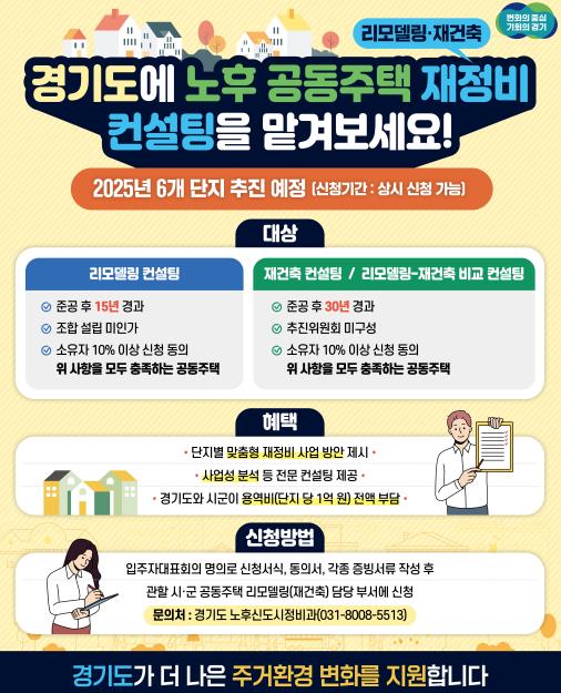 [뉴스노크=김인호 기자] 경기도가 오래된 아파트 소유자들이 리모델링이나 재건축 여부를 객관적으로 판단할 수 있도록 컨설팅 비용 1억 원을 지원하는 ‘경기도 공동주택 재정비 컨설팅 사업’을 추진한다며 참여를 당부했다.