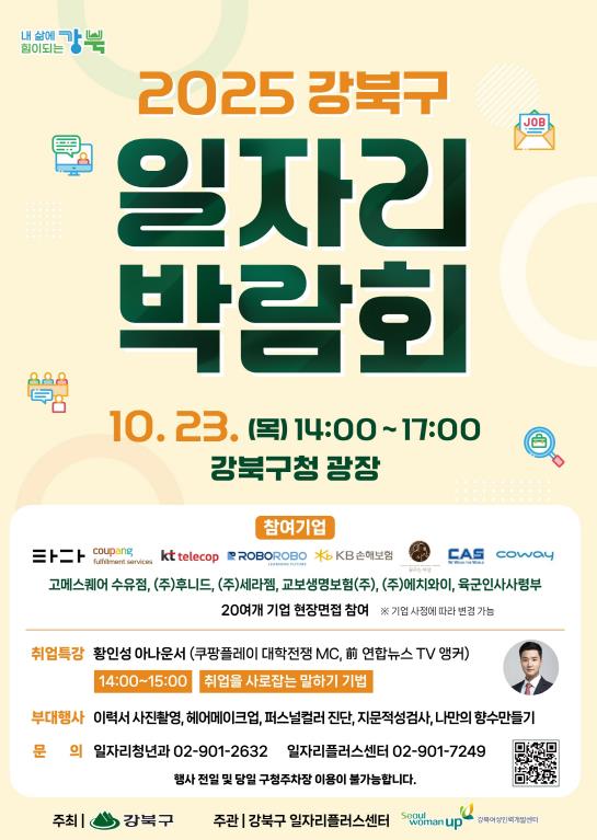 특히 같은 날 오후 2시 강북구청 4층 대강당에서 진행될 취업특강에서는 쿠팡플레이 '대학전쟁' 프로그램 진행자로 잘 알려진 황인성 아나운서가 연사로 나서 ‘취업을 사로잡는 말하기 기법’을 주제로 실전 노하우를 전한다.