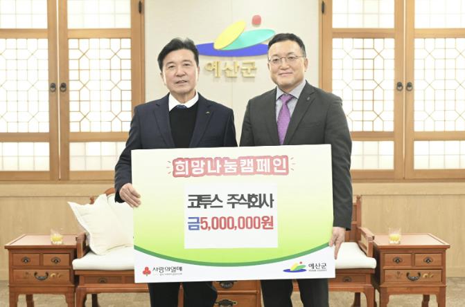 [뉴스노크=김인호 기자] 예산군은 예당호 모노레일 운영회사인 주식회사 코투스가 어려운 이웃을 돕기 위한 ‘희망 2026 나눔캠페인’에 동참해 성금 500만 원을 기탁했다고 2일 밝혔다.