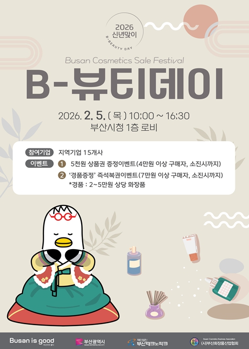[뉴스노크=김인호 기자] 부산시는 오는 2월 5일 오전 10시부터 오후 4시 30분까지 시청 1층(대강당-대회의실 앞)에서 '2026 설맞이 비(B)-뷰티 데이'를 개최한다고 오늘(2일) 밝혔다.