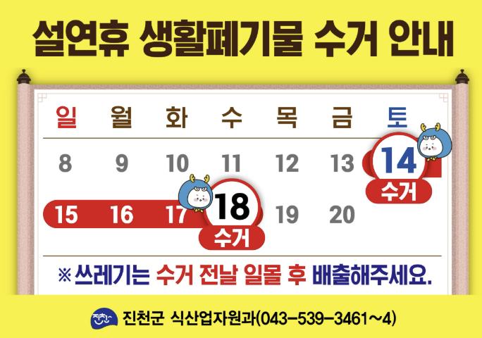 또한 군은 연휴 기간 발생할 수 있는 불편에 대비해 14일부터 18일까지 ‘생활 쓰레기 상황반’을 운영할 방침이다.
