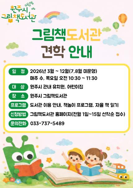 [뉴스노크=김인호 기자] 원주시 그림책도서관은 오는 3월부터 12월까지 관내 유치원과 어린이집을 대상으로 어린이 견학 프로그램을 운영한다.