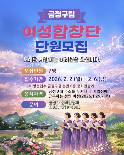 [뉴스노크=김인호 기자] 부산 금정구는 금정구 문화예술 발전에 기여하고 수준 높은 공연 문화를 이끌어 갈 금정구립 여성합창단 단원을 모집한다고 2일 밝혔다.