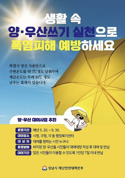 [뉴스노크=김인호 기자] 성남시는 여름철 폭염과 집중호우에 대응해 시민 건강을 보호하고 생활 편의를 높이기 위해, 오는 9월 30일까지 ‘양산·우산 무료 대여사업’을 운영한다.