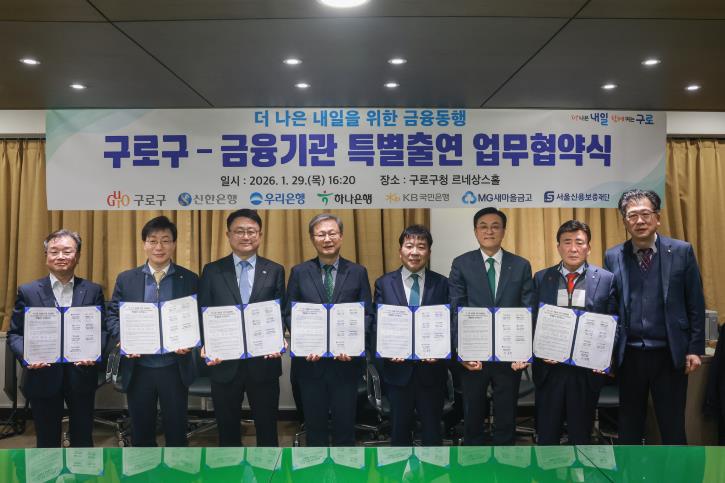 [뉴스노크=김인호 기자] 구로구가 1월 29일 구청 3층 르네상스홀에서 신한은행, 우리은행, 하나은행, 국민은행, 새마을금고, 서울신용보증재단과 ‘더 나은 내일을 위한 금융동행’ 특별출연 협약을 체결하고, 총 212억 5천만 원 규모의 중소기업·소상공인 특례보증을 추진한다.