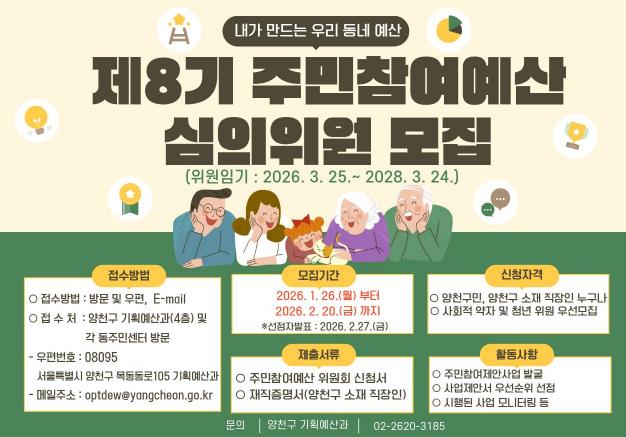 참여를 원하는 구민은 양천구청 기획예산과 또는 각 동 주민센터 방문, 이메일로 신청하면 된다. 최종 선정 결과는 2월 27일 양천구 홈페이지 게시 및 개별 통보로 안내된다.
