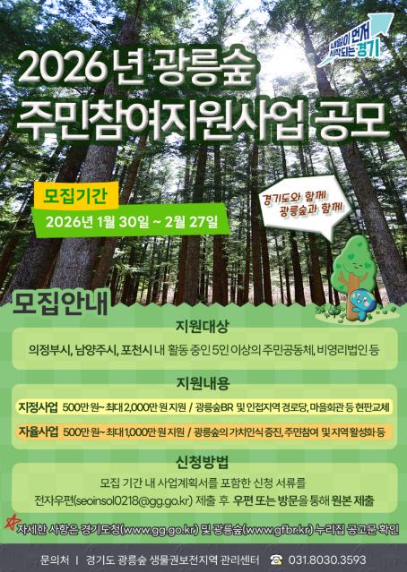 [뉴스노크=김인호 기자] 경기도가 광릉숲 생물권보전지역 활성화를 위해 2026년 광릉숲 주민참여지원사업 참여자를 모집한다.