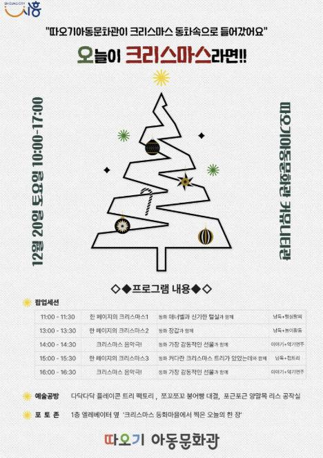 [뉴스노크=김인호 기자] 시흥시 따오기아동문화관이 오는 12월 20일 크리스마스 문화행사 ‘오늘이 크리스마스라면’을 연다. 반짝이는 트리, 서늘한 겨울 공기, 책장을 넘기는 소리가 한데 어우러지며 문화관은 잠시 ‘이야기가 살아 움직이는 공간’으로 변한다.