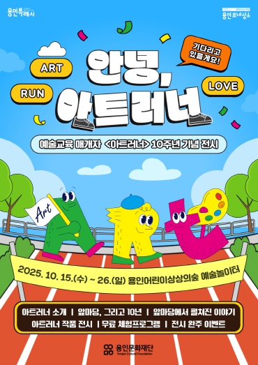 [뉴스노크=김인호 기자] (재)용인문화재단은 예술교육 매개자 ‘아트러너(Art Runner)’ 사업 10주년을 맞아 오는 10월 15일부터 26일까지 용인어린이상상의숲 예술놀이터에서 기념 전시 '안녕, 아트러너'를 개최한다.