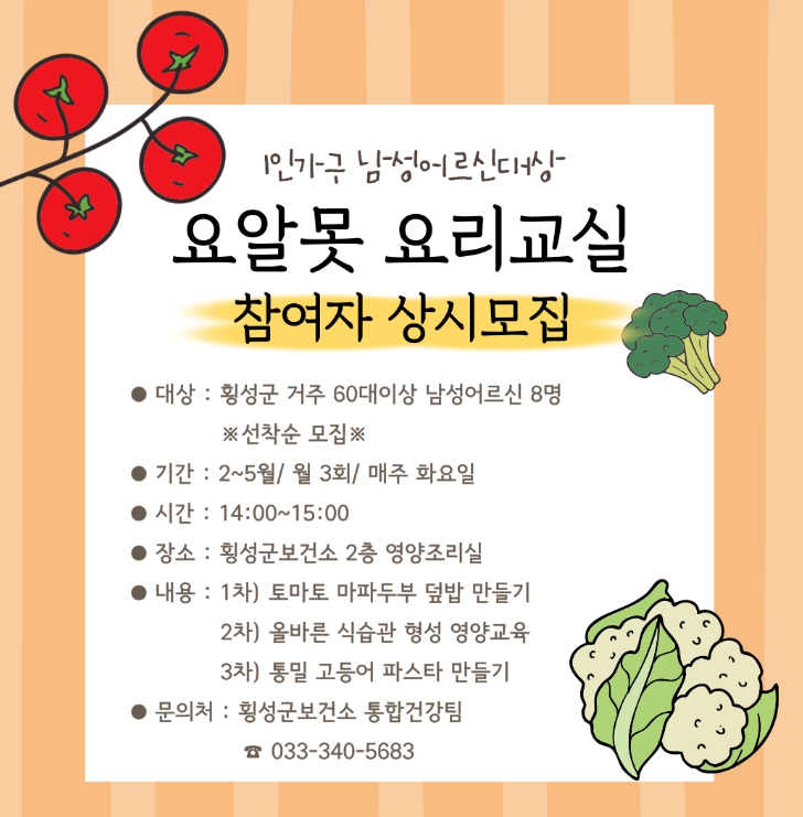 [뉴스노크=김인호 기자] 횡성군은 1인가구 남성 어르신의 건강한 식생활 형성과 영양관리 강화를 위해 2월부터 5월까지 “요알못(요리를 알지 못하는) 영양교실”을 운영한다.