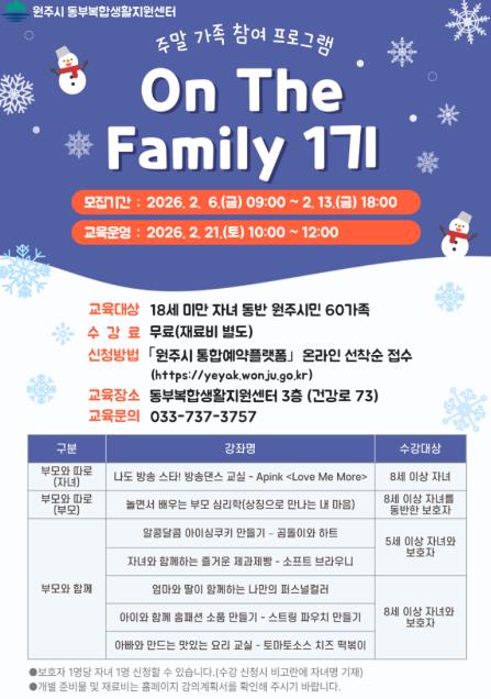 [뉴스노크=김인호 기자] 원주시 동부복합생활지원센터는 오는 21일 주말 가족 참여 프로그램 ‘온 더 패밀리(On The Family)’ 1기 과정을 운영한다.