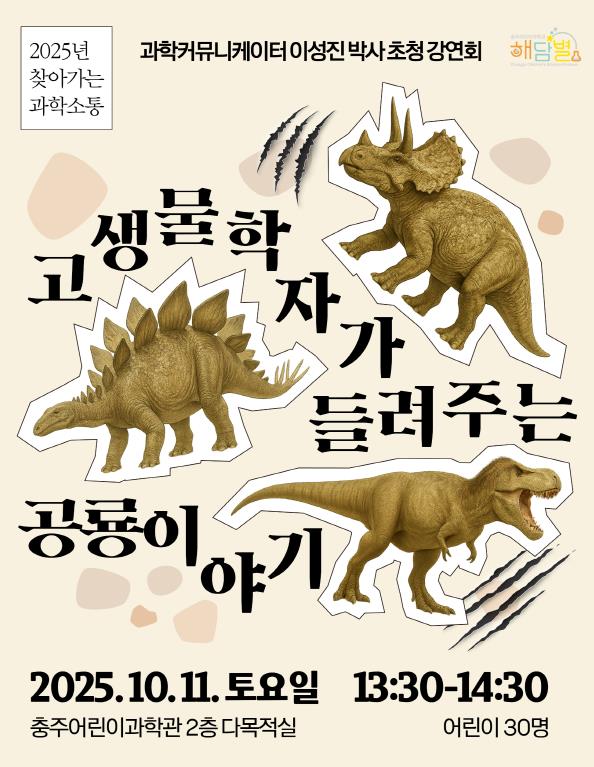 [뉴스노크=김인호 기자] 충주어린이과학관은 오는 10월 11일, 과학커뮤니케이터로 활동 중인 고생물학자 이성진 박사를 초청해 초등 저학년 어린이를 위한 특별 강연 ‘고생물학자가 들려주는 공룡 이야기’를 개최한다고 밝혔다.