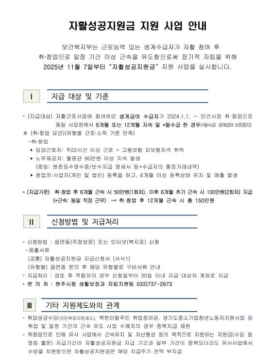 [뉴스노크=김인호 기자] 원주시는 오는 26일까지 2025년 ‘자활성공지원금’ 신청을 접수한다.