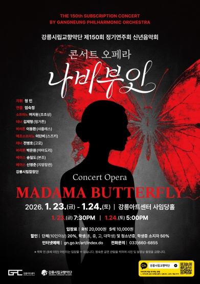 [뉴스노크=김인호 기자] 강릉시립교향악단은 2026년의 첫 정기연주회로 오는 23일(금) 19시 30분, 24일(토) 17시 강릉아트센터 사임당홀에서 콘서트 오페라‘나비부인’을 선보인다.