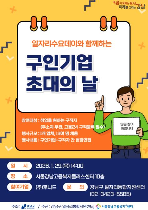 [뉴스노크=김인호 기자] 꿈이 모이는 도시, 미래를 그리는 강남구가 구인기업과 구직자를 현장에서 연결하는 소규모 채용 행사 ‘구인기업 초대의 날’을 기업 수요에 맞춘 수시 운영 방식으로 개편하고, 오는 1월 29일 오후 2시 서울강남고용복지플러스센터에서 현장면접을 진행한다.