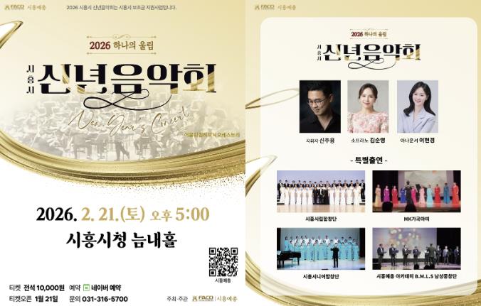 [뉴스노크=김인호 기자] 시흥시가 지원하고 (사)한국예술문화단체총연합회 시흥지회에서 주관하는 ‘2026 시흥시 신년음악회- 하나의 울림’이 오는 2월 21일 오후 5시, 시청 늠내홀에서 개최된다.