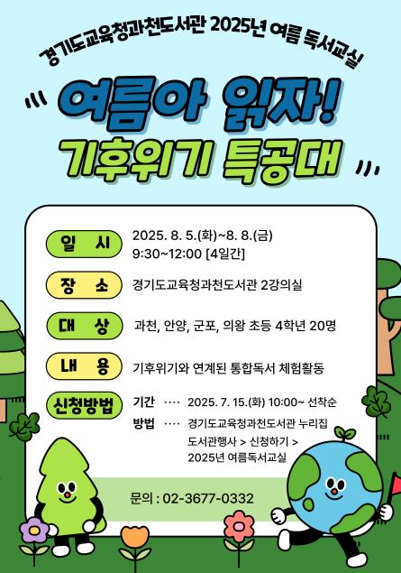 [뉴스노크=김인호 기자] 경기도교육청과천도서관이 다가오는 여름방학을 맞이하여 ‘여름아 읽자! 기후위기 특공대’를 주제로 독서교실을 운영한다.