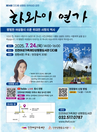 [뉴스노크=김인호 기자] 인천여성가족재단 성평등도서관 다다름은 이진영 감독을 초청해 '하와이 연가 : 평범한 여성들이 이룬 위대한 사랑의 역사'을 주제로 제14회 다다름 성평등 아카데미 강연을 개최한다고 밝혔다.