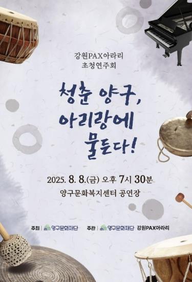 [뉴스노크=김인호 기자] 양구문화재단은 오는 8월, 지역 주민들의 문화 향유 기회를 확대하고 예술적 감성을 채워줄 기획공연 두 편을 양구문화복지센터 공연장에서 선보인다. 첫 번째 공연은 8월 8일 오후 7시 30분에 열리는 앙상블 공연 '강원PAX아라리'이며, 두 번째 공연은 8월 16일 오후 2시와 5시에 1일 2회 진행되는 가족 뮤지컬 '페페의 꿈'이다.