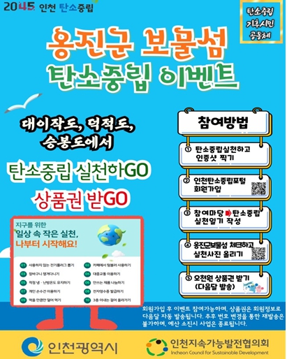 참여 방법은 인천탄소중립포털에 회원가입 후‘탄소중립 실천일기 작성’ 메뉴에서 ‘옹진군 보물섬 탄소중립 이벤트’를 선택하면 된다.