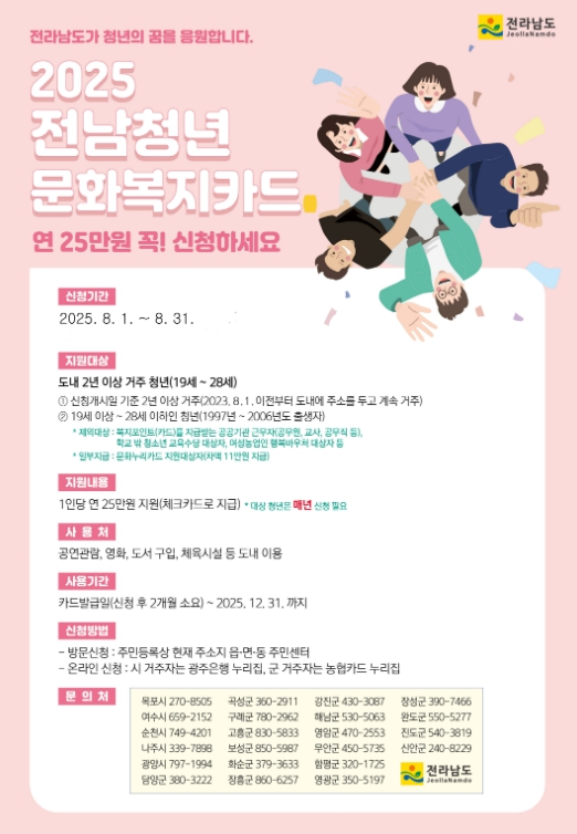 [뉴스노크=김인호 기자] 전라남도가 오는 31일까지 지역 청년의 문화·여가 활동을 지원하는 ‘청년 문화복지카드’ 지원사업 신청자를 추가 모집한다.