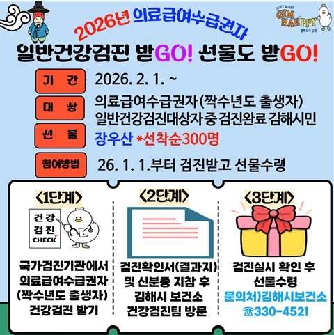 [뉴스노크=김인호 기자] 김해시보건소는 2026년 새해를 맞아 의료 취약계층의 질병을 조기에 발견하고 예방하기 위해 의료급여수급권자를 대상으로 『일반건강검진 받GO! 선물도 받GO!』 이벤트를 실시한다고 밝혔다.