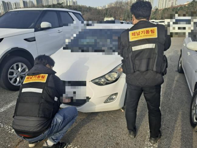 ▲ 안산시 체납기동팀이 체납차량에 대한 번호판 영치 작업을 진행하고 있다. |