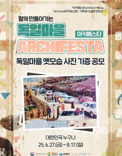 [뉴스노크=김인호 기자] 남해군관광문화재단은 함께 만들어가는 아키페스타(Archifesta) ‘독일마을 옛모습 사진 기증 공모’를 진행한다고 밝혔다.