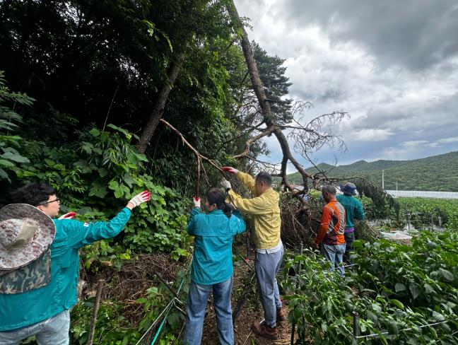 [뉴스노크=김인호 기자] 고창군 아산면 주민행복센터 직원들이 최근 할머니의 고추밭 한가운데로 쓰러진 대형 소나무를 처리하며 주민 안전확보에 나섰다.