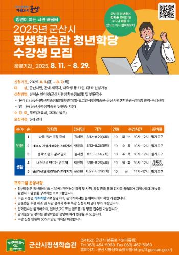 [뉴스노크=김인호 기자] 군산시평생학습관이 청년 강사들과 함께 지역사회에 활력을 불어넣는 ‘2025년 청년학당 프로그램’을 오는 8월 11일부터 8월 29일까지 운영한다.