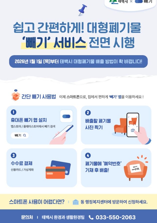 [뉴스노크=김인호 기자] 태백시는 2026년 1월 1일부터 대형폐기물 배출 신청부터 수수료 결제, 처리 결과 확인까지 전 과정을 스마트폰 앱 ‘빼기’를 통해 원스톱으로 처리할 수 있는 서비스를 본격 시행한다고 밝혔다.