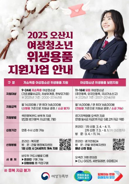 [뉴스노크=김인호 기자] 오산시가 여성청소년의 건강권 보장을 위해 추진 중인 ‘2025년 여성청소년 위생용품 보편지원’의 2차 신청 접수를 시작했다.