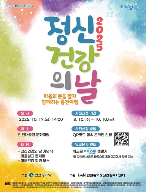 [뉴스노크=김인호 기자] 인천광역시는 10월 17일 인천대공원 문화마당에서 ‘마음의 문을 열자, 함께하는 충전 여행’이란 주제로‘2025년 정신건강의 날 기념행사’를 개최한다.