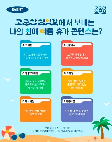 선택할 수 있는 여름휴가 콘텐츠는 여객선 관광·선상낚시·캠핑 및 백패킹·해안 트레킹(걷기여행)·미식 체험·어촌 체험으로 총 6가지이다.