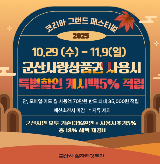 [뉴스노크=김인호 기자] 군산시가 오는 29일부터 11월 9일까지 12일간 정부가 추진하는 ‘코리아 그랜드 페스티벌’에 참여해 군산사랑상품권 이용자에게 파격적인 추가 혜택을 제공한다.