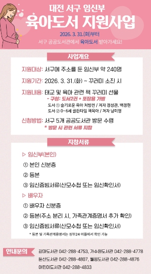 [뉴스노크=김인호 기자] 대전 서구 공공도서관은 3월 31일부터 ‘임신부 육아 도서 지원사업’을 운영한다.