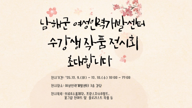[뉴스노크=김인호 기자] 남해군 여성인력개발센터는 오는 12월 9일∼10일 양일간 한 해를 마무리하는 작품 전시회를 개최한다.